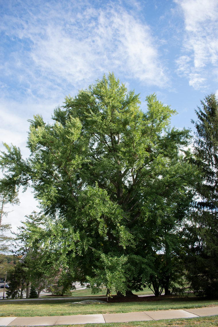 Ginkgo, or Maidenhair Tree, is a deciduous gymnosperm that is more closely related to pines and spruces than to maples and oaks. Ginkgo is one of the best known examples of a living fossil. For centuries it was believed to be extinct, but was found growing in eastern China. Ginkgo trees are dioecious, so there are male and female individuals. Female trees produce seeds with a soft, odiferous (rancid butter), fruit-like exterior, but the interior “nut” is edible and used in traditional Asian cooking.